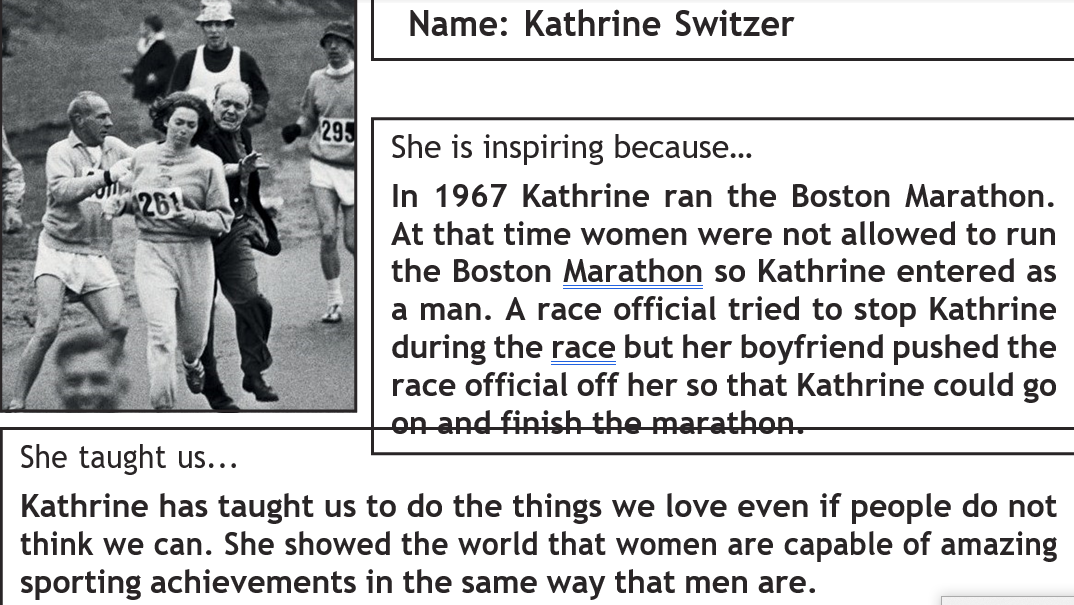 Kathrine nos ensinou a fazer as coisas que amamos, mesmo que as pessoas pensem que não podemos. Ela mostrou ao mundo que as mulheres são capazes de conquistas esportivas incríveis da mesma forma que os homens.